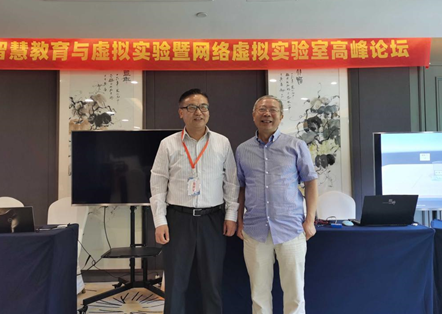(4)5月25日,在"智慧教育与虚拟实验暨网络虚拟实验室"高峰论坛上,为30多位中学校校长以及骨干教师做科普讲座,图片为与学军中学校长合影。