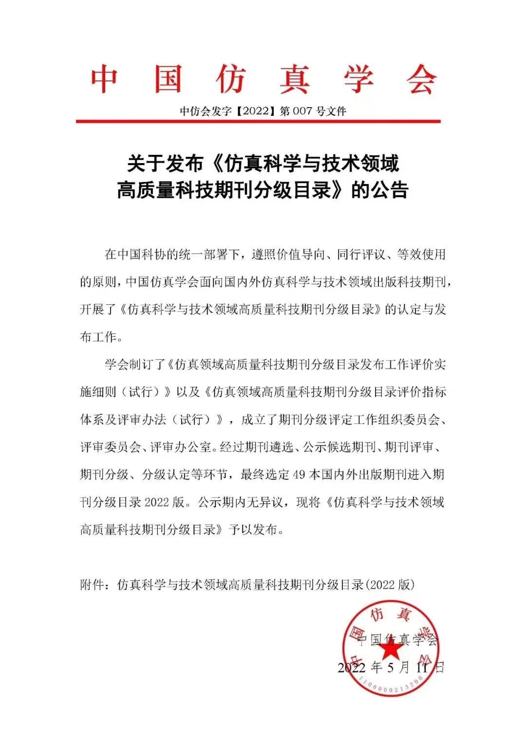 关于发布《仿真科学与技术领域 高质量科技期刊分级目录》的公告