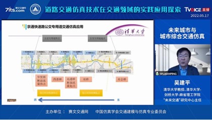 在主题报告环节,吴建平教授首先重点围绕"仿真技术在未来城市建设中的应用"展开了交流,并分享了FLOWSIM仿真软件的实践应用及案例。实践案例从通州快速公交网络仿真评价、路面轻轨信号优先仿真优化、在线交通仿真、数字孪生/虚拟城市/城市仿真几个模块进行展开。