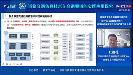 深圳市城市交通规划设计研究中心交通信息与模型院院长丘建栋就"高强度交通走廊双层立体扩容设计优化仿真技术研究"的主题发表演讲,该课题以深圳机荷高速立体改扩建工程为例,分享了仿真技术在深圳机荷高速中的应用与实践情况;从现状背景、工程方案、工程难点、研究思路等四个角度对工程进行了概述;列举分享了四个仿真平台并对平台应用进行了评估;展示了在应用成效与推广上交通仿真的应用价值。
