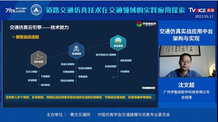广州学塾加软件科技有限公司总经理沈文超博士做了主题为"交通仿真实战应用中台架构与实现"的演讲,分析了仿真技术应用存在的问题,呼吁从应用到技术的实战坚守。介绍了交通仿真实战应用中台——交通仿真云引擎及学塾加软件,并分享了交通仿真实战应用案例。