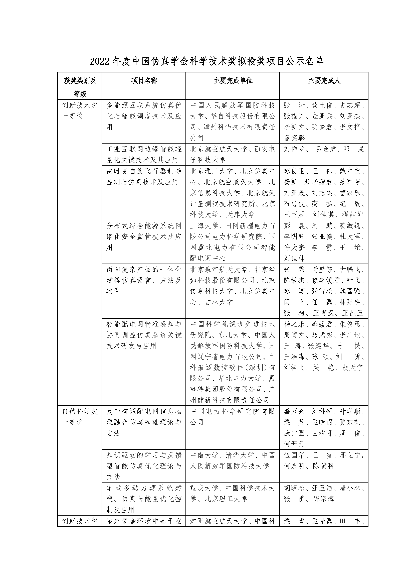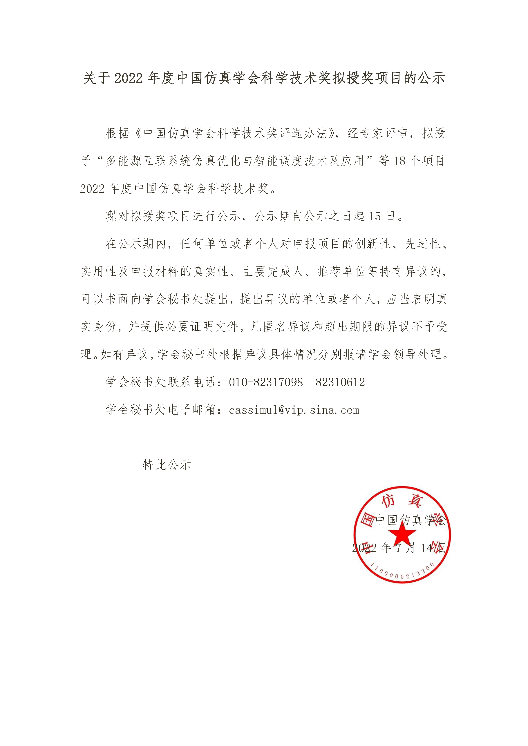 关于2022年度中国仿真学会科学技术奖拟授奖项目的公示