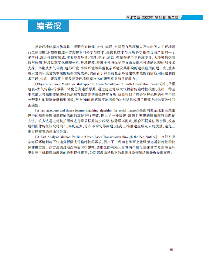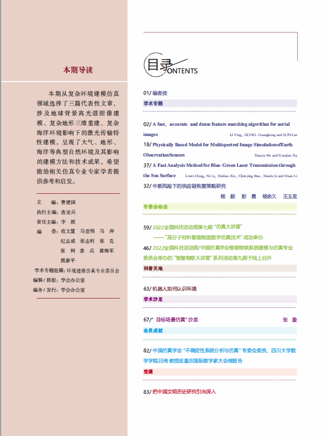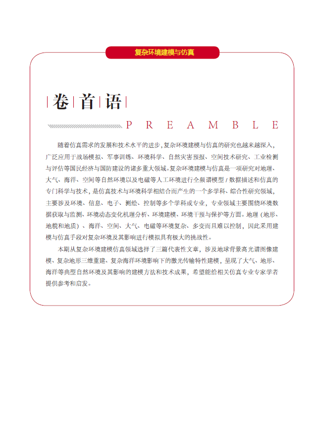 【导读】本期从复杂环境建模仿真领域选择了三篇代表性文章,涉及地球背景高光谱图像建模、 复杂地形三维重建、 复杂海洋环境影响下的激光传输特性建模, 呈现了大气、 地形、海洋等典型自然环境及其影响的建模方法和技术成果, 希望能给相关仿真专业专家学者提供参考和启发。