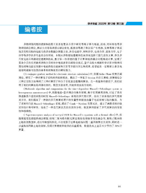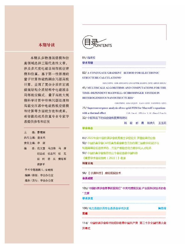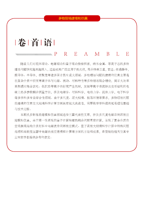本期从多物理场建模和仿真领域选择三篇代表性文章,涉及多尺度电磁非局部效应建模和仿真,基于第一性原理的量子计算和磁热耦合问题高效计算,呈现了复杂介质在宏观微观结构介质材料中电磁波非局部效应模式、量子高效大规模科学计算中特殊问题处理和高能变压器中电磁热效应建模和计算等方面的方法和成果,希望能给相关仿真专业专家学者提供参考和启发。