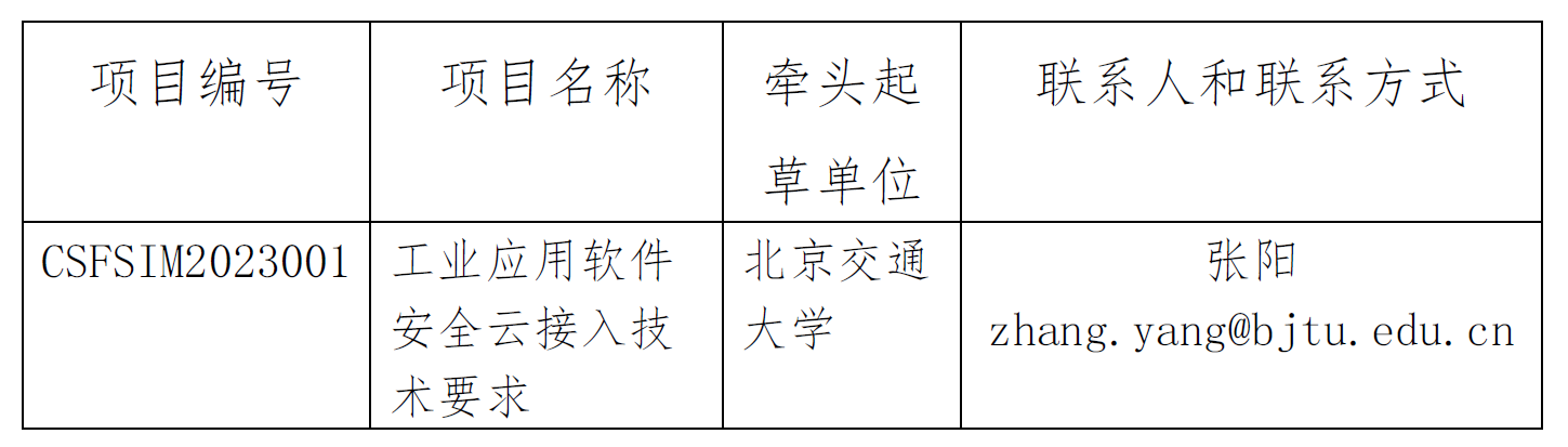 根据《中国仿真学会团体标准管理办法》的有关规定,经中国仿真学会组织的评审组审议,决定批准《工业应用软件安全云接入技术要求》团体标准立项。请标准牵头起草单位北京交通大学根据《中国仿真学会团体标准管理办法》的规定,开展标准编制工作。