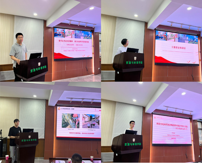 资源与环境学院实验教学中心教工党支部书记王雅婧在交流中分享了如何弘扬科技小院精神。同时,通过不断提高实验教学中心的服务水平,为练就兴农本领的同学们打造良好的实验条件和学习氛围。博士2022级植营气象党支部书记严文辉分享了他对扎根村屯农家、服务乡村振兴的理解,只有扎根于农业生产一线,才更能了解乡土中国,发现更具有实践指导意义的科学问题。本科生应用气象学党支部书记田浩良结合自身参与的学院及党支部工作,分享了科技小院的起源与发展进程,以及科技小院如何做到习近平总书记所说的"解民生,治学问"。