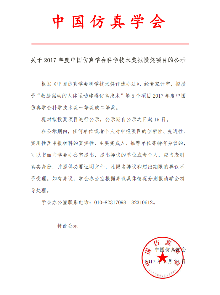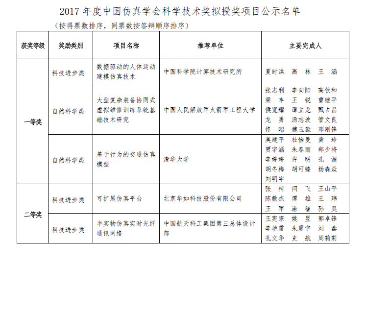 2017年度中国仿真学会科学技术奖拟授奖项目的公示