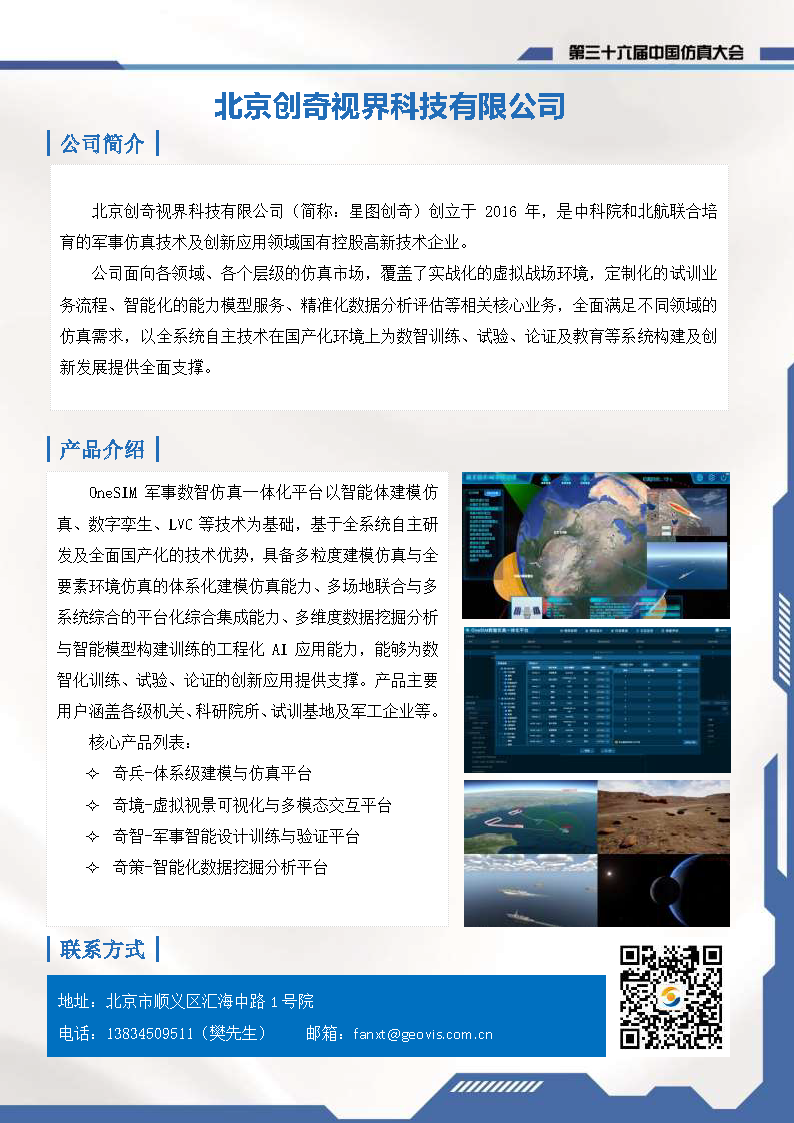 北京创奇视界科技有限公司(简称:星图创奇)创立于 2016 年,是中科院和北航联合培育的军事仿真技术及创新应用领域国有控股高新技术企业。