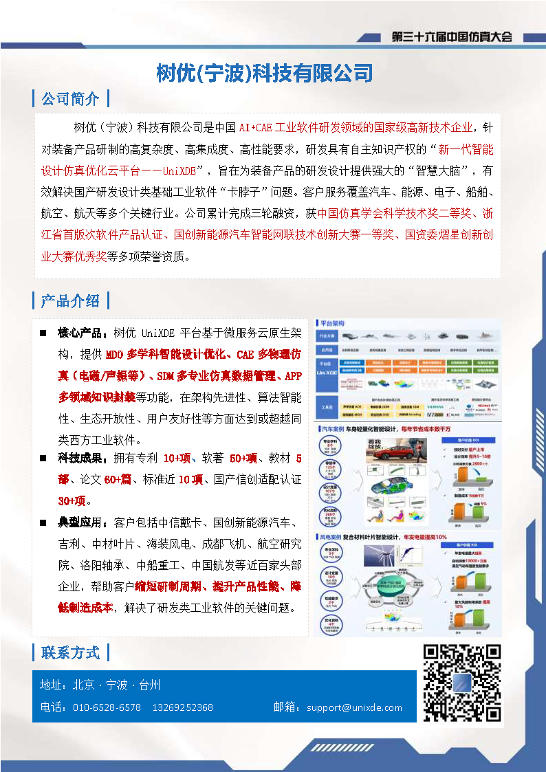 树优(宁波)科技有限公司是中国AI+CAE工业软件研发领域的国家级高新技术企业,针对装备产品研制的高复杂度、高集成度、高性能要求,研发具有自主知识产权的"新一代智能设计仿真优化云平台——UniXDE",旨在为装备产品的研发设计提供强大的"智慧大脑",有效解决国产研发设计类基础工业软件"卡脖子"问题。客户服务覆盖汽车、能源、电子、船舶、航空、航天等多个关键行业。公司累计完成三轮融资,获中国仿真学会科学技术奖二等奖、浙江省首版次软件产品认证、国创新能源汽车智能网联技术创新大赛一等奖、国资委熠星创新创业大赛优秀奖等多项荣誉资质。