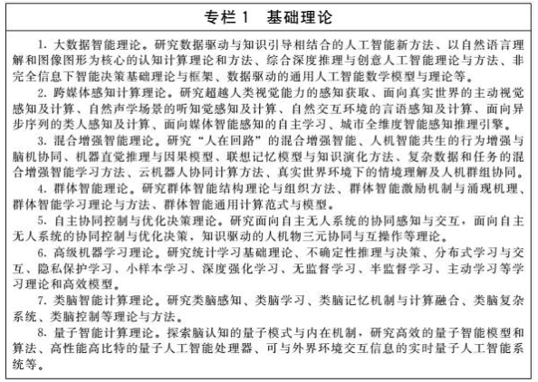 布局前沿基础理论研究。针对可能引发人工智能范式变革的方向,前瞻布局高级机器学习、类脑智能计算、量子智能计算等跨领域基础理论研究。高级机器学习理论重点突破自适应学习、自主学习等理论方法,实现具备高可解释性、强泛化能力的人工智能。类脑智能计算理论重点突破类脑的信息编码、处理、记忆、学习与推理理论,形成类脑复杂系统及类脑控制等理论与方法,建立大规模类脑智能计算的新模型和脑启发的认知计算模型。量子智能计算理论重点突破量子加速的机器学习方法,建立高性能计算与量子算法混合模型,形成高效精确自主的量子人工智能系统架构。