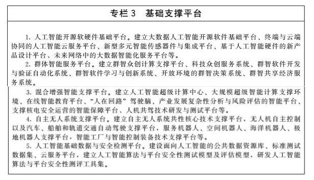 建设布局人工智能创新平台,强化对人工智能研发应用的基础支撑。人工智能开源软硬件基础平台重点建设支持知识推理、概率统计、深度学习等人工智能范式的统一计算框架平台,形成促进人工智能软件、硬件和智能云之间相互协同的生态链。群体智能服务平台重点建设基于互联网大规模协作的知识资源管理与开放式共享工具,形成面向产学研用创新环节的群智众创平台和服务环境。混合增强智能支撑平台重点建设支持大规模训练的异构实时计算引擎和新型计算集群,为复杂智能计算提供服务化、系统化平台和解决方案。自主无人系统支撑平台重点建设面向自主无人系统复杂环境下环境感知、自主协同控制、智能决策等人工智能共性核心技术的支撑系统,形成开放式、模块化、可重构的自主无人系统开发与试验环境。人工智能基础数据与安全检测平台重点建设面向人工智能的公共数据资源库、标准测试数据集、云服务平台等,形成人工智能算法与平台安全性测试评估的方法、技术、规范和工具集。促进各类通用软件和技术平台的开源开放。各类平台要按照军民深度融合的要求和相关规定,推进军民共享共用。