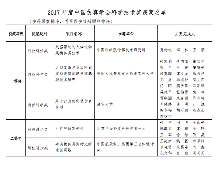 中国仿真学会科学技术奖评选结果的公告