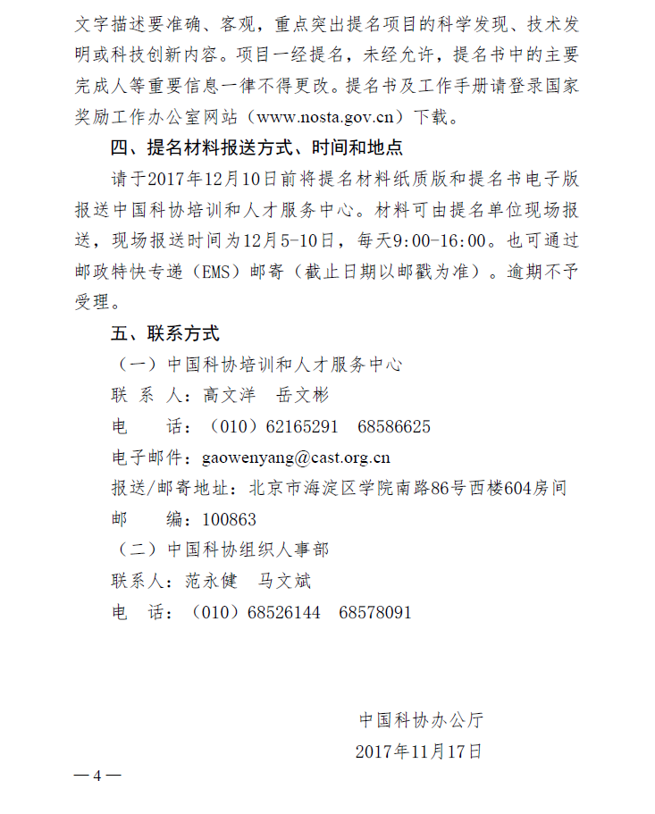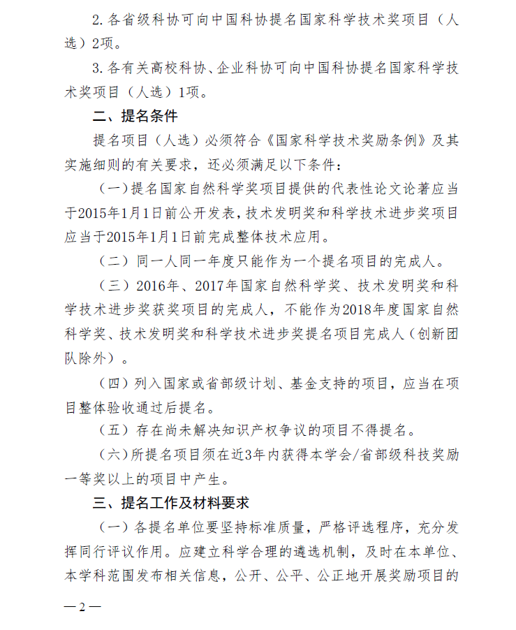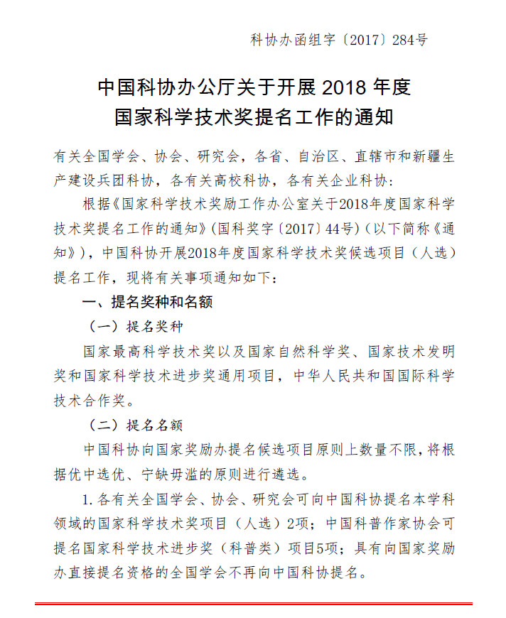 中国科协办公厅关于开展2018年度 国家科学技术奖提名工作的通知
