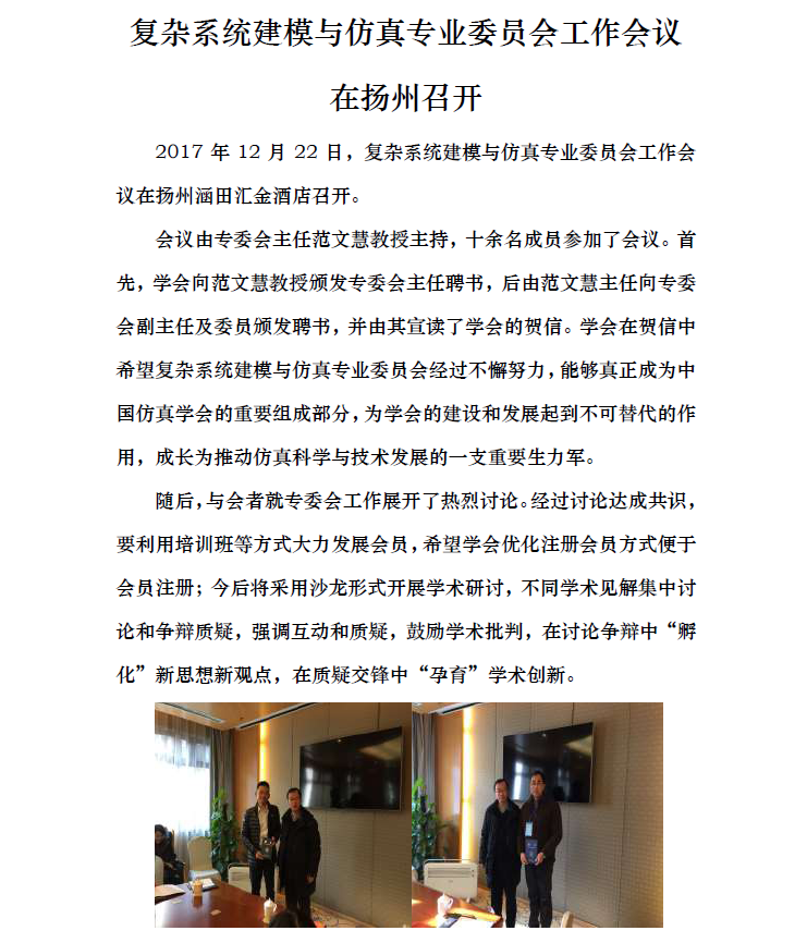 复杂系统建模与仿真专业委员会工作会议在扬州召开
