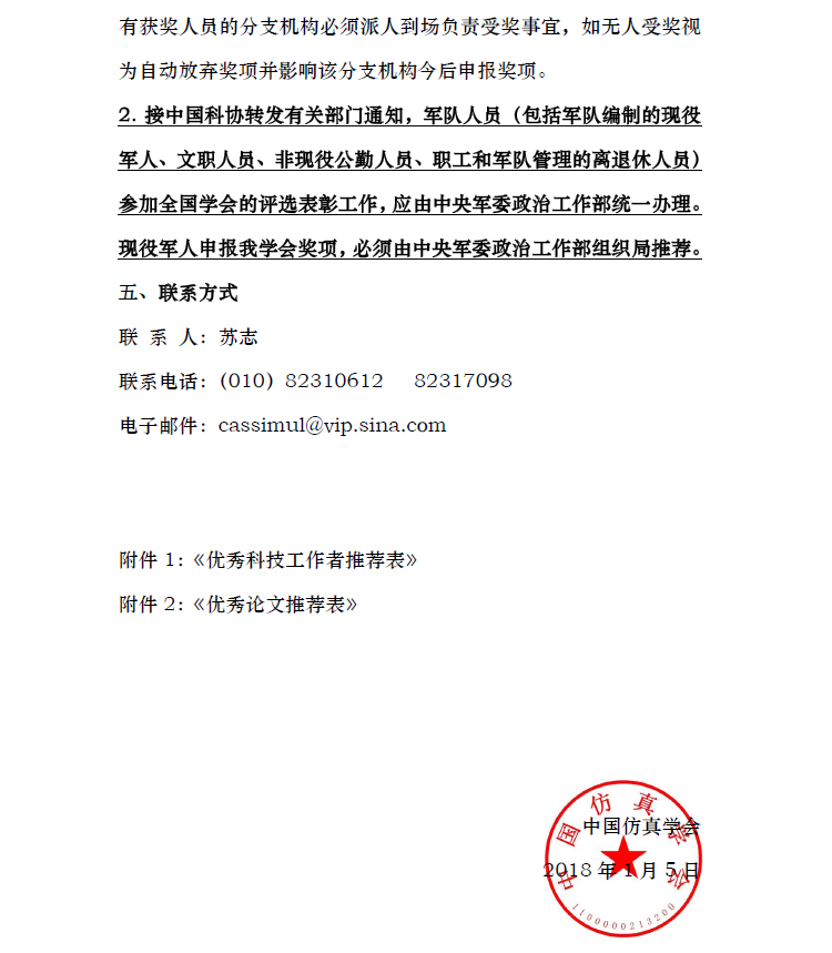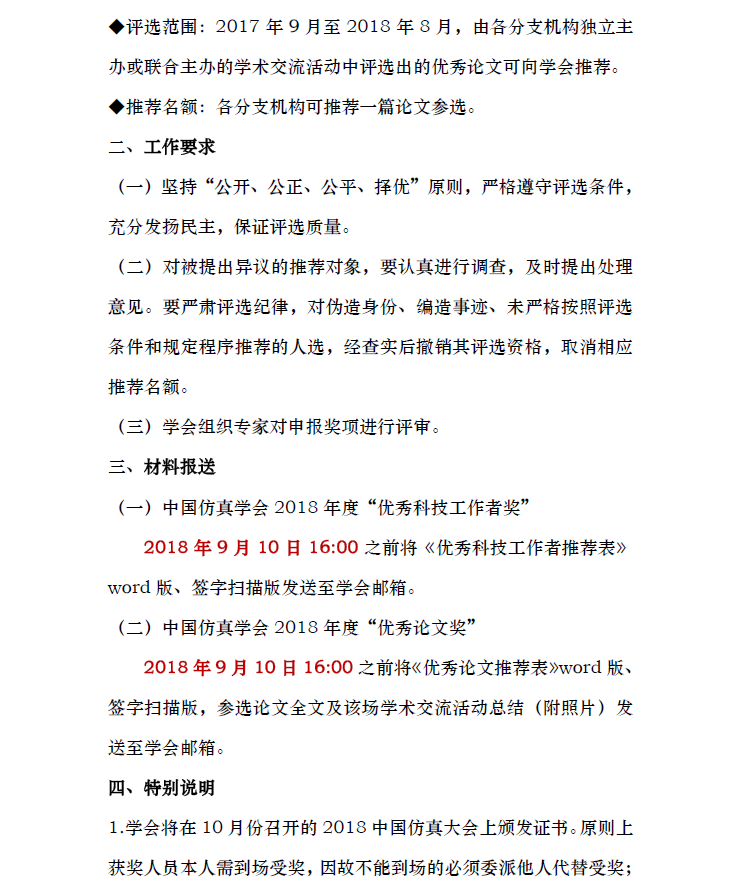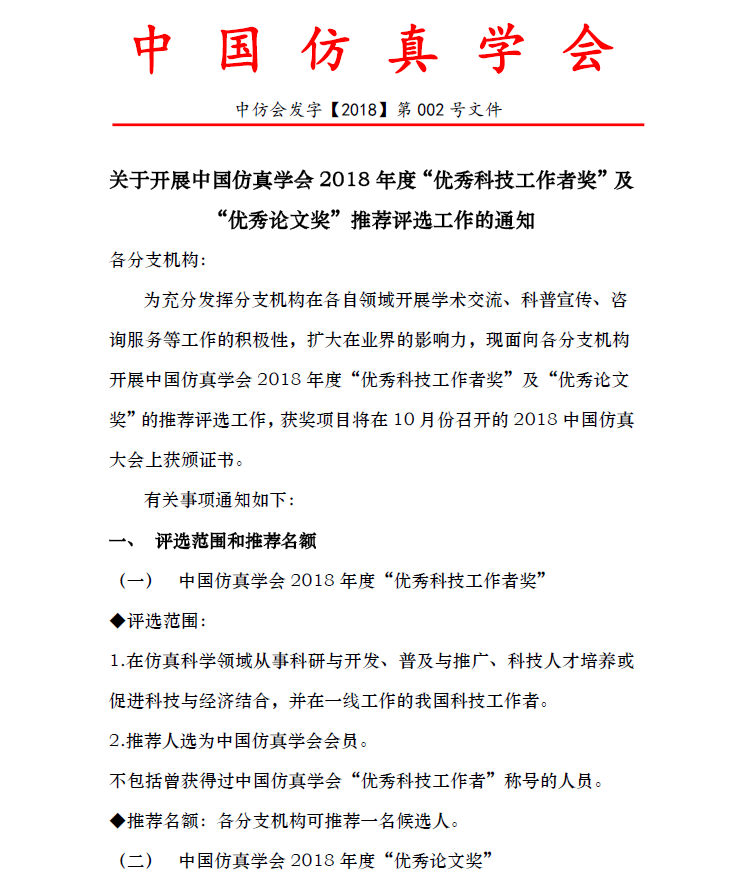 关于开展中国仿真学会2018年度"优秀科技工作者奖"及"优秀论文奖"推荐评选工作的通知