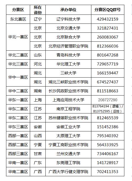 2018年竞赛即将开始,各分赛区正在积极筹备中。为方便各参赛队联系分赛区咨询预约练习、分赛区初赛等事宜, 全国14个分赛区18所高校开通了分赛区QQ群,并由分赛区相关负责老师统一管理。特公布分赛区QQ群号如下: