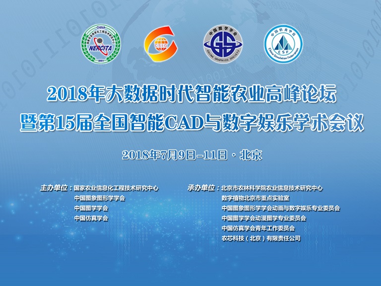 "2018年大数据时代智能农业高峰论坛"暨"第15届全国智能CAD与数字娱乐学术会议"由国家农业信息化工程技术研究中心、中国图象图形学学会、中国图学学会、中国仿真学会联合主办,北京市农林科学院、北京农业信息技术研究中心、数字植物北京市重点实验室、农芯科技(北京)有限公司、中国图象图形学学会动画与数字娱乐专委会、中国图学学会动漫图学工程专业委员会、中国仿真学会青年工作委员会联合承办,于2018 年7月9日-11日在北京友谊宾馆举行。本次会议以人工智能、大数据、虚拟仿真、数字媒体为背景,着力推进虚拟仿真、数字媒体技术在现代智能农业领域的应用方面的前沿新技术、新方法与产业化交流讨论,旨在促进虚拟仿真、数字媒体、人工智能和农业信息技术领域的交叉融合与创新研究、农业物联网大数据解析与处理、农业数字动漫技术与文化创意、智能农业技术集成与工程化应用等方面深入交流,达成广泛合作共识。
