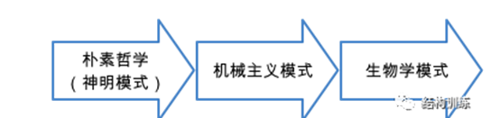 人类社会普遍出现的疾病越看越多,投入巨大收效却甚微,似乎走入一个死循环,这不得不引起我们对现代医学模式的深思,这也是我们对待医学科学范式本源的追问。医学模式是在不同的社会发展时期和科学发展阶段,人类建立了与之适应的认识和解决健康问题的哲学思考。截止目前,医学模式简单分为三种(如图3),第一种是在古代主要是神明模式和朴素哲学模式,比如在中国建立了中国阴阳五行学病理学说。第二种,随着人类进入工业革命,在人也是一部无比精密的机器的观点下,医学演化成了机械唯物模式。第三种,随着近代现代科技不断发展,解剖学、细胞学、生物分子学等学科的出现,现代生物医学模式逐步形成。