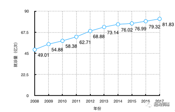 图2 医疗卫生机构诊疗人次(数据来自国家统计局2008-2017)