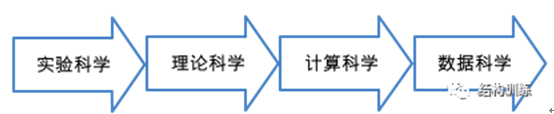 从原始的钻木取火,发展到后来以伽利略为代表的文艺复兴时期的科学发展初级阶段,人类主要以记录和描述自然现象为特征开展科学研究,开启了现代科学之门,称为"实验科学",为第一科学研究范式;由于受到当时实验条件的限制,第一科学研究范式指导下开展的工作难于完成对自然现象更精确的理解。科学家们开始尝试尽量简化实验模型,去掉一些复杂的干扰,只留下关键因素,以微积分为基本工具,建立一个理想的完美模型,通过演算进行归纳总结,比如,牛顿三大定律成功解释了经典力学,麦克斯韦理论成功解释了电磁学,这就是第二范式,即以模型推演为特征的理论科学。20世纪中叶,科学研究的复杂计算超越了实验设计,随着验证理论的难度和经济投入越来越高,科学研究越来越依赖计算,尤其冯·诺依曼提出了现代电子计算机架构,利用电子计算机对科学实验进行模拟仿真的模式得到迅速普及,人们可以对复杂现象通过模拟仿真,推演出越来越多复杂的现象,随着计算机仿真越来越多地取代实验,逐渐成为科研的常规方法,即第三范式计算科学。截至目前,人类已经建立了前三类科学范式(如图4)。