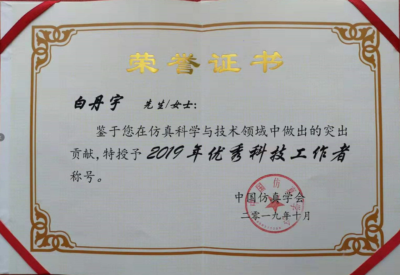 白丹宇委员(大连海事大学)荣获2019年度"中国仿真学会优秀科技工作者奖"。