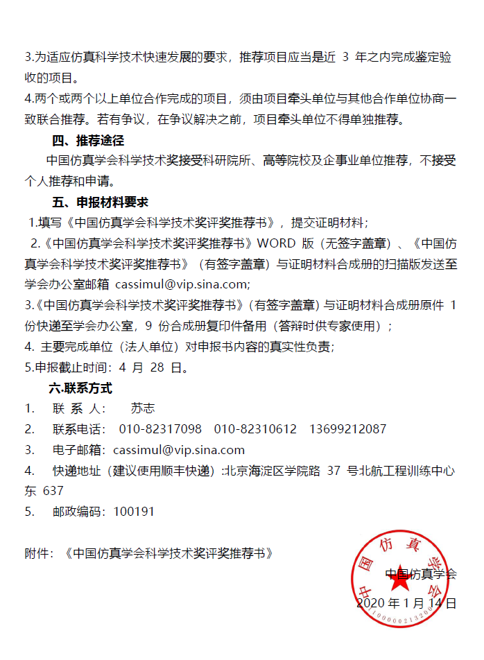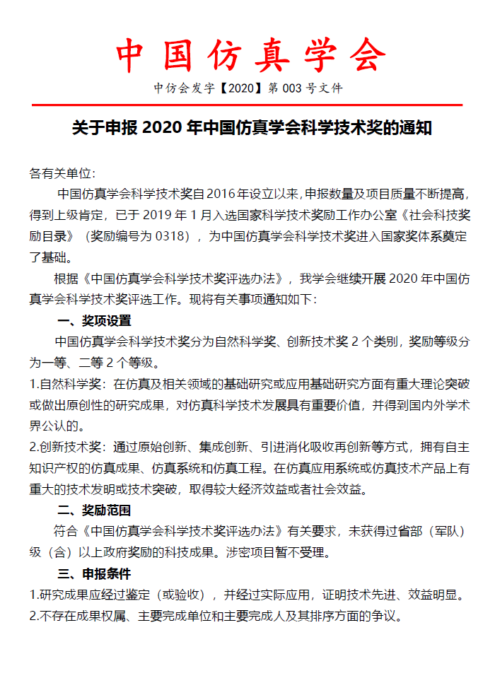 关于申报2020年中国仿真学会科学技术奖的通知