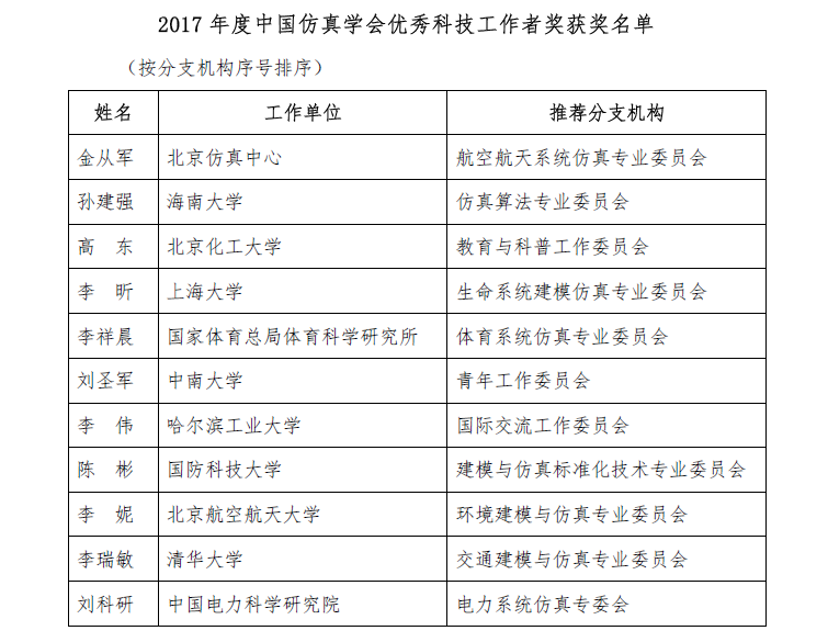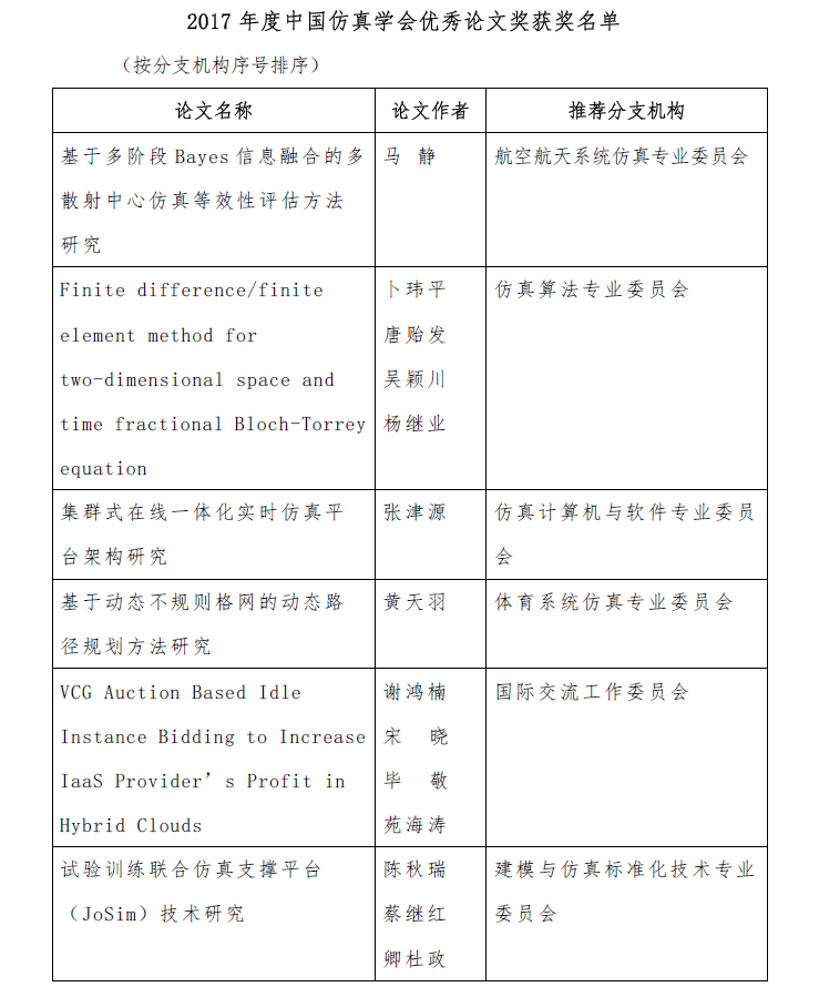 2017年度中国仿真学会"优秀科技工作者"、"优秀论文"名单