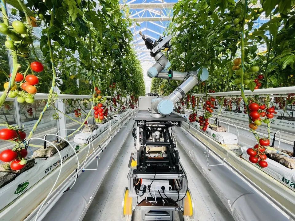 温室大棚里,一株株番茄藤蔓间,零星能看到黄色的花朵正在绽放。与普通番茄花有雄蕊和雌蕊不同,这里的番茄花雄蕊开裂、花粉败育,只有雌蕊(柱头)裸露在外——这是育种中经常使用的雄性不育系亲本。智能育种机器人"吉儿"行走其间,精准地识别出花朵,机械臂伸出,轻轻触碰雌蕊的柱头,仅需十几秒,一次杂交授粉就完成了。